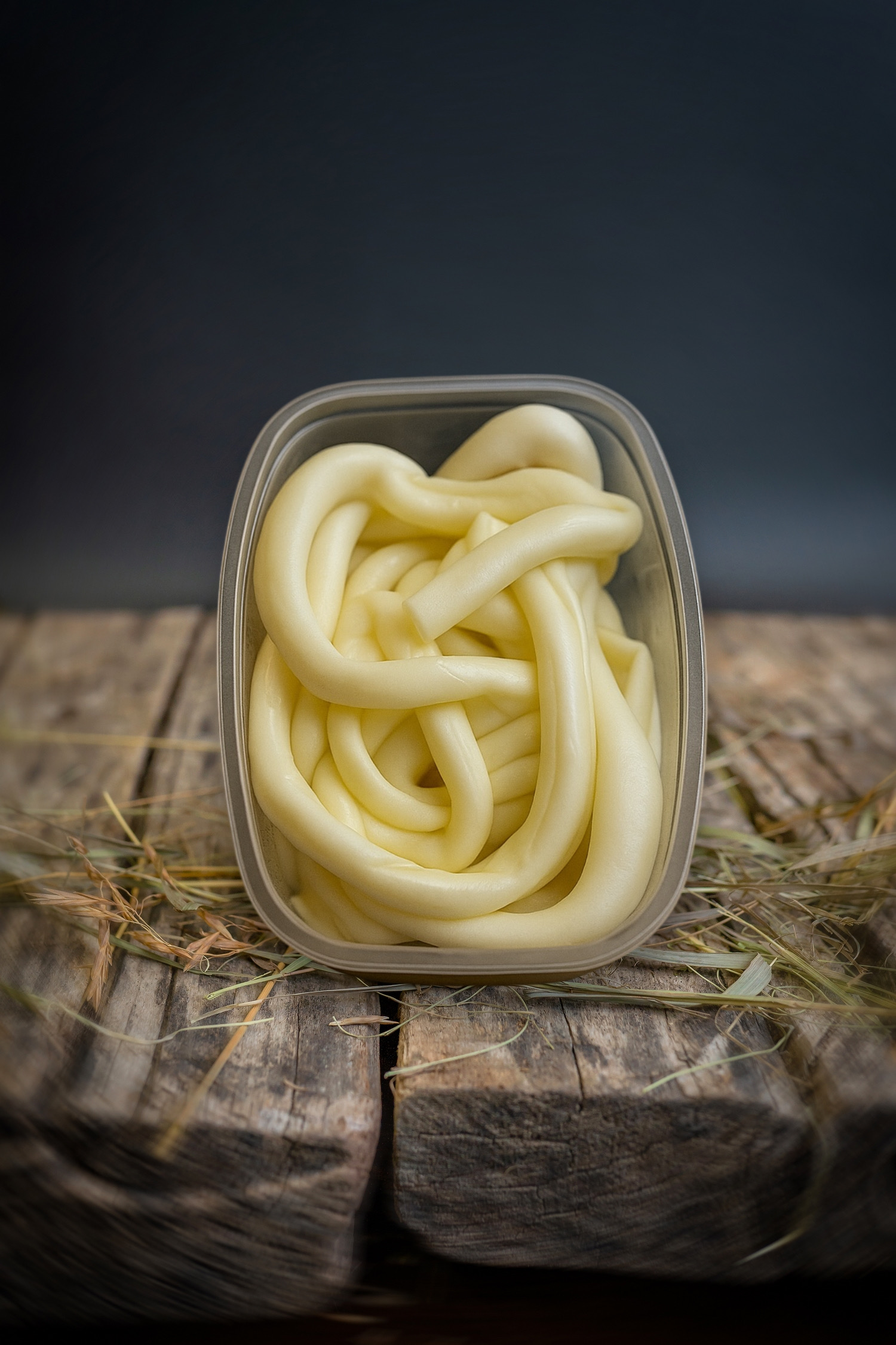 Страчателла- по-настоящему нежный сыр. Его изготавливают для начинки буррата, но можно употреблять и как самостоятельное блюдо. Волокна моцареллы разбираются вручную, что делает этот сыр тающим во рту.