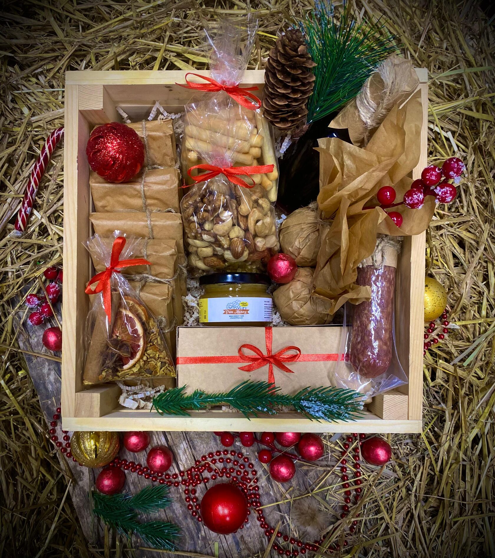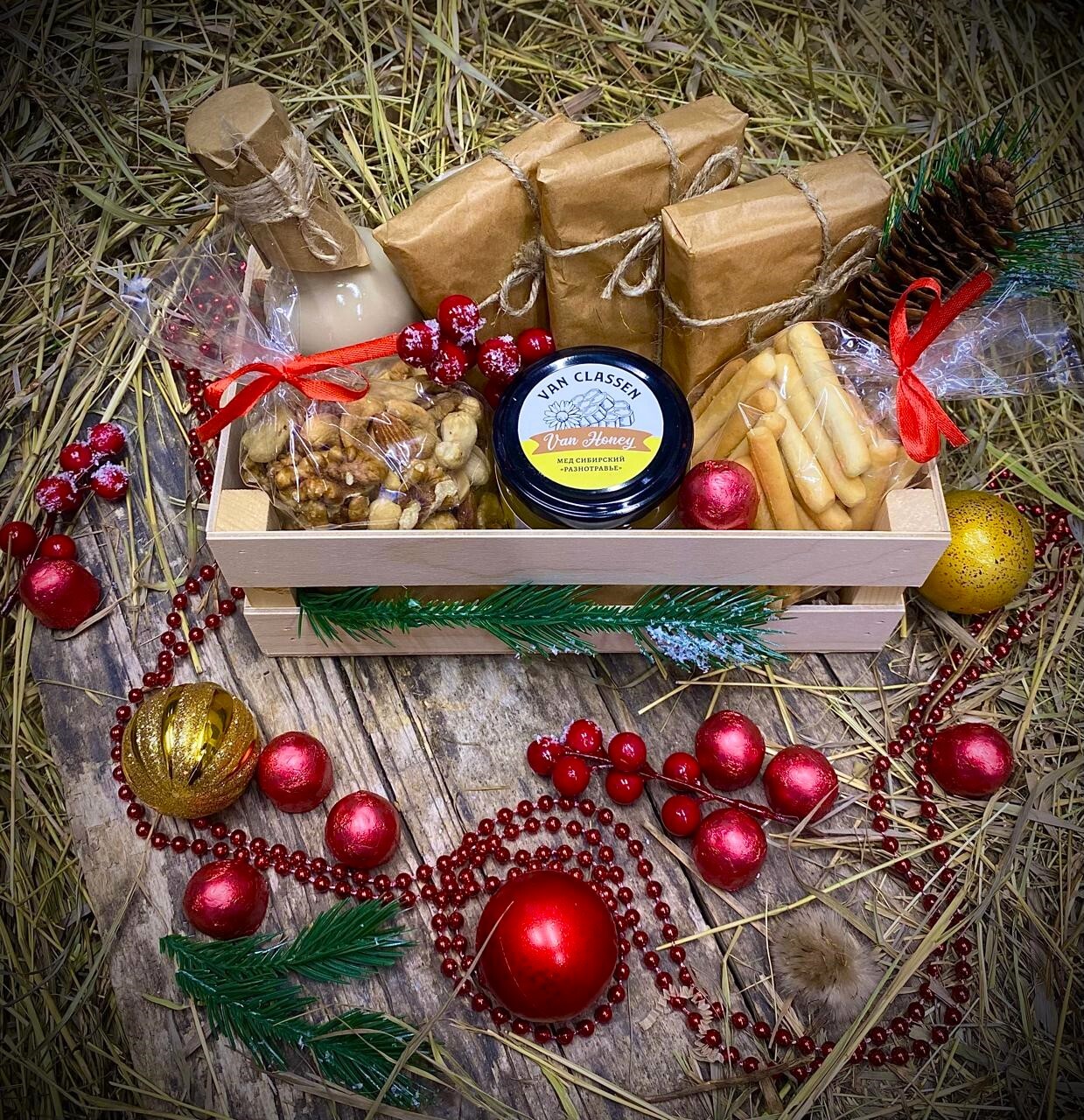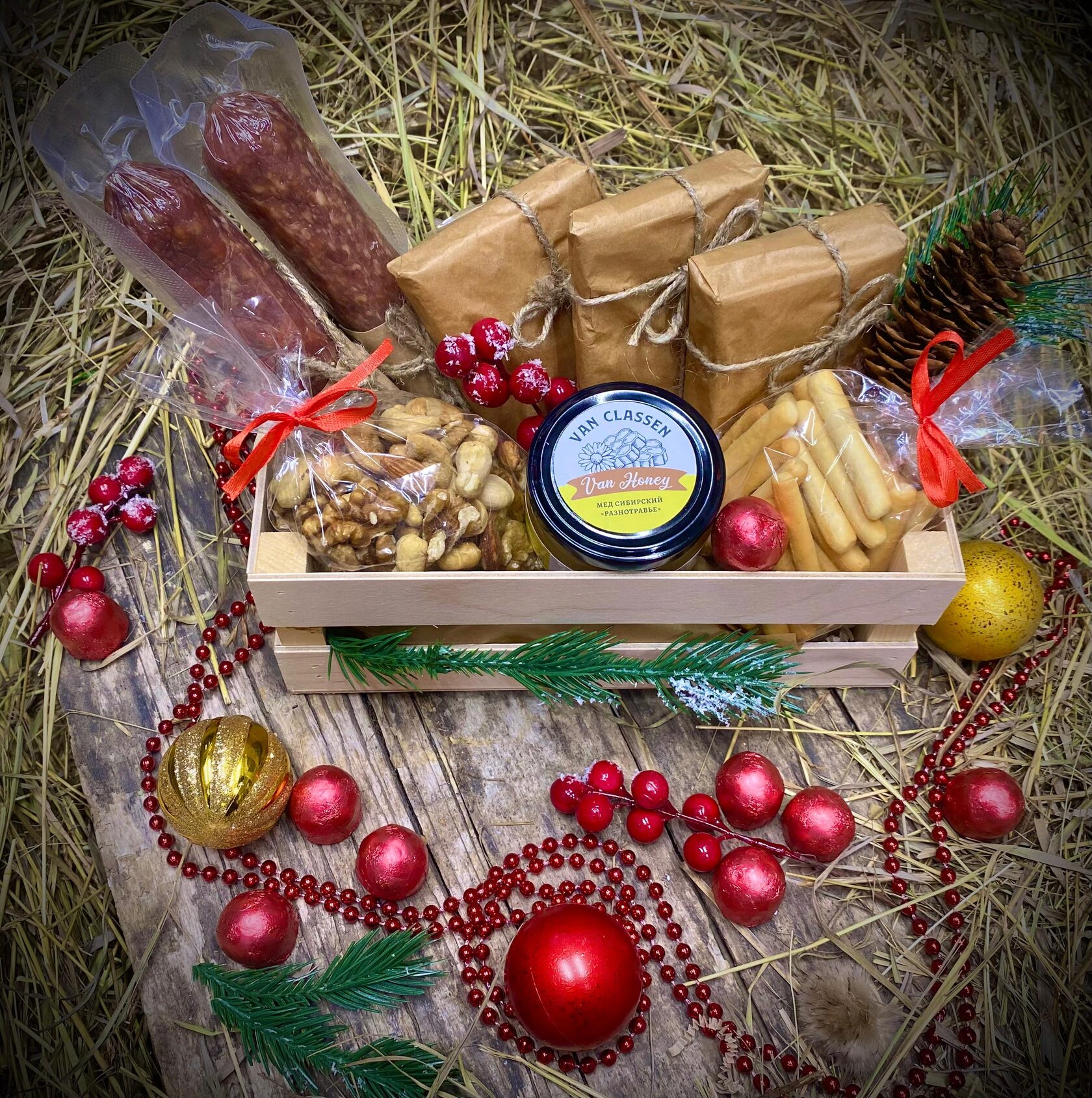 Young + Young с пажитником + Young с сушеными грибами+ Medium+Premium+VAN CLASSEN Белпер Кнолле (с черным перцем)+ VAN CLASSEN Белпер Кнолле (с паприкой)+ Масло сливочное 82,5%, Фермерская колбаса с клюквой, Мёд от Van Classen, Крафтовый напиток от Томской винокурни, Клюква вяленая, Набор специй для глинтвейна, Сырные палочки, Смесь орехов.