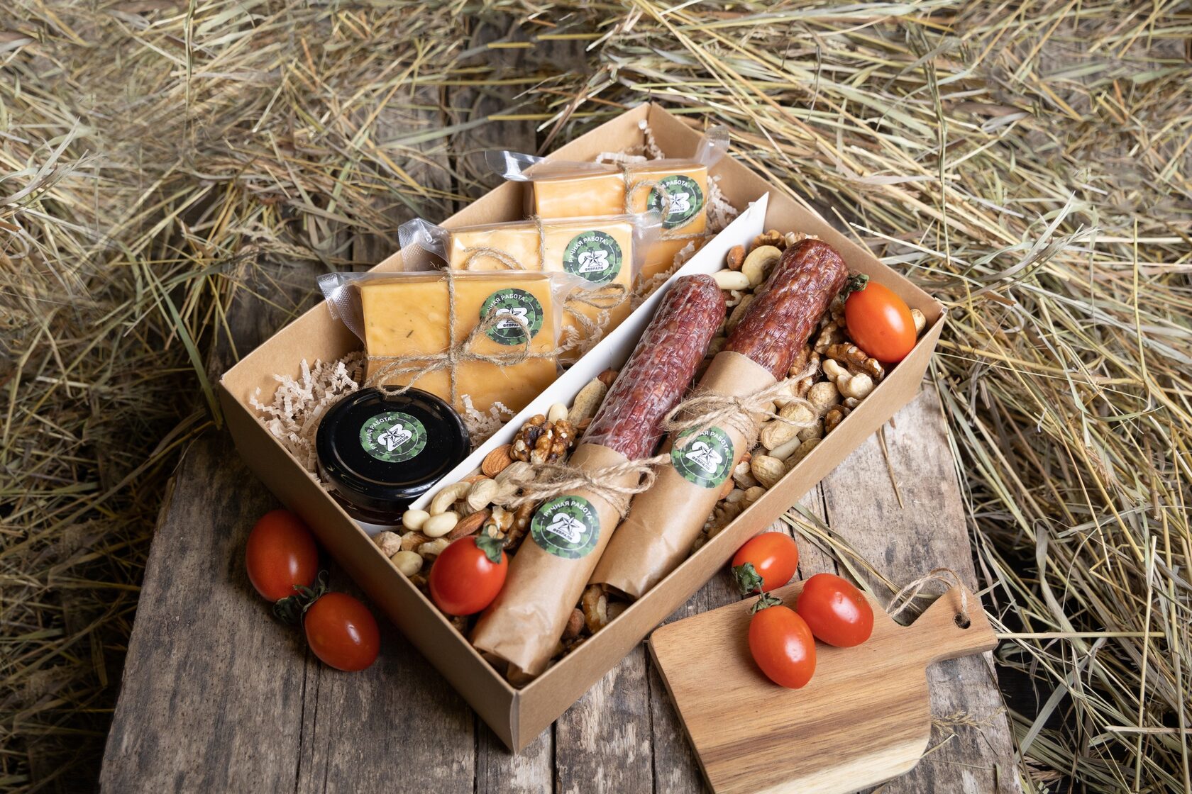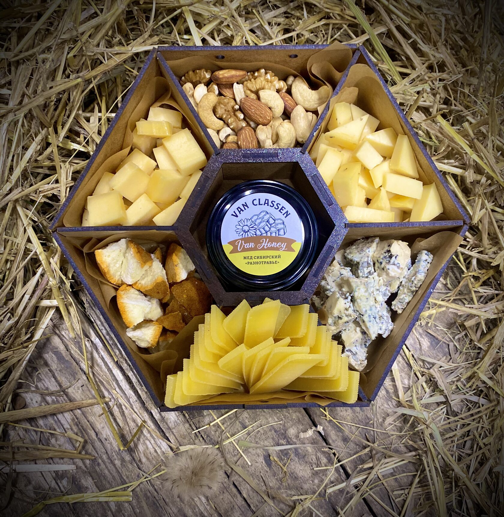 Состав набора: Young (170 гр), Young с пажитником (170 гр), Young с псушеными грибами (170 гр), Medium (170 гр), Premium (200 гр), Белпер Кнолле (с черным перцем) (100 гр), Белпер Кнолле (с паприкой)(100 гр), Сливочное масло 82,5% (200 гр) в стеклянной банке, Мёд от Van Classen (100 гр), Фермерская колбаса с клюквой (200 гр), Набор специй для глинтвейна (50 гр), Крафтовый напиток алкогольный на выбор (300 мл), Смесь орехов (150 гр), Сырные палочки (200 гр), Открытка, Памятка "правила хранения сыра в домашних условиях"